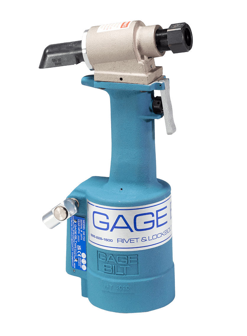 The GB731 is a pneumatic-hydraulic installation tool designed specifically for the efficient installation of blind rivets and lockbolts. It weighs 5.75 lbs. (2.61 kg) and can be operated in any position. It has a .600" (15.24 mm) fastener setting stroke and a rated pull load of 4,800 lbs. (21.35 kN) with 90 psi (6.2 bar) air pressure at the air inlet.