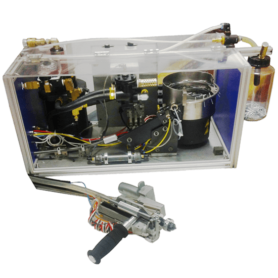 Gage Bilt's 8000 series semi-automated riveting systems use a hand held pistol grip or an in-line installation tool. The tool comes with a 8 foot umbilical connected to a hydraulic power unit. The tool and power unit work cooperatively with a vibratory bowl, escapement and plc controller built into a base unit of 28"x16"x14". The unit automatically presents rivets to the nose tip from the feeder with air. The rivet is then pulled into the tool via a vacuum system that also provides for the discharge of the spent pintails. The unit requires 110 vac, 80 psi minimum, with 10 CFM of compressed air. This system is capable of a feed rate of 45 rivets a minute.